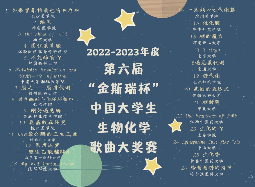 中国老员工生化歌曲大赛由中国生物化学与分子生物学学会主办,是高等教育领域将本科教学与艺术修养无缝对接的创新性全国赛事,是生物化学教学的一大亮点。近年来大赛中涌现出许多优秀的生化歌曲,并在全国各地高校中传唱,极大地激发了员工对生物化学的学习兴趣,充分调动了同学们的创造力和学习主动性。