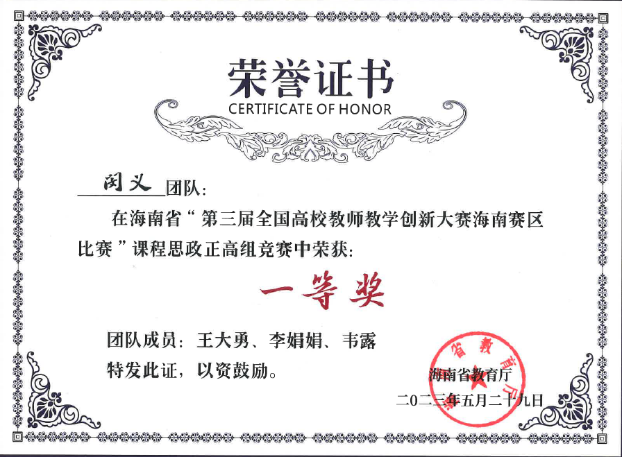 近日,海南省教育厅公布了第三届全国高校教师教学创新大赛海南赛区比赛结果,公司闵义教授负责的《细胞生物学》课程团队(成员:王大勇、李娟娟、韦露)荣获课程思政正高组一等奖,并推荐参加第三届全国高校教师教学创新大赛国赛。