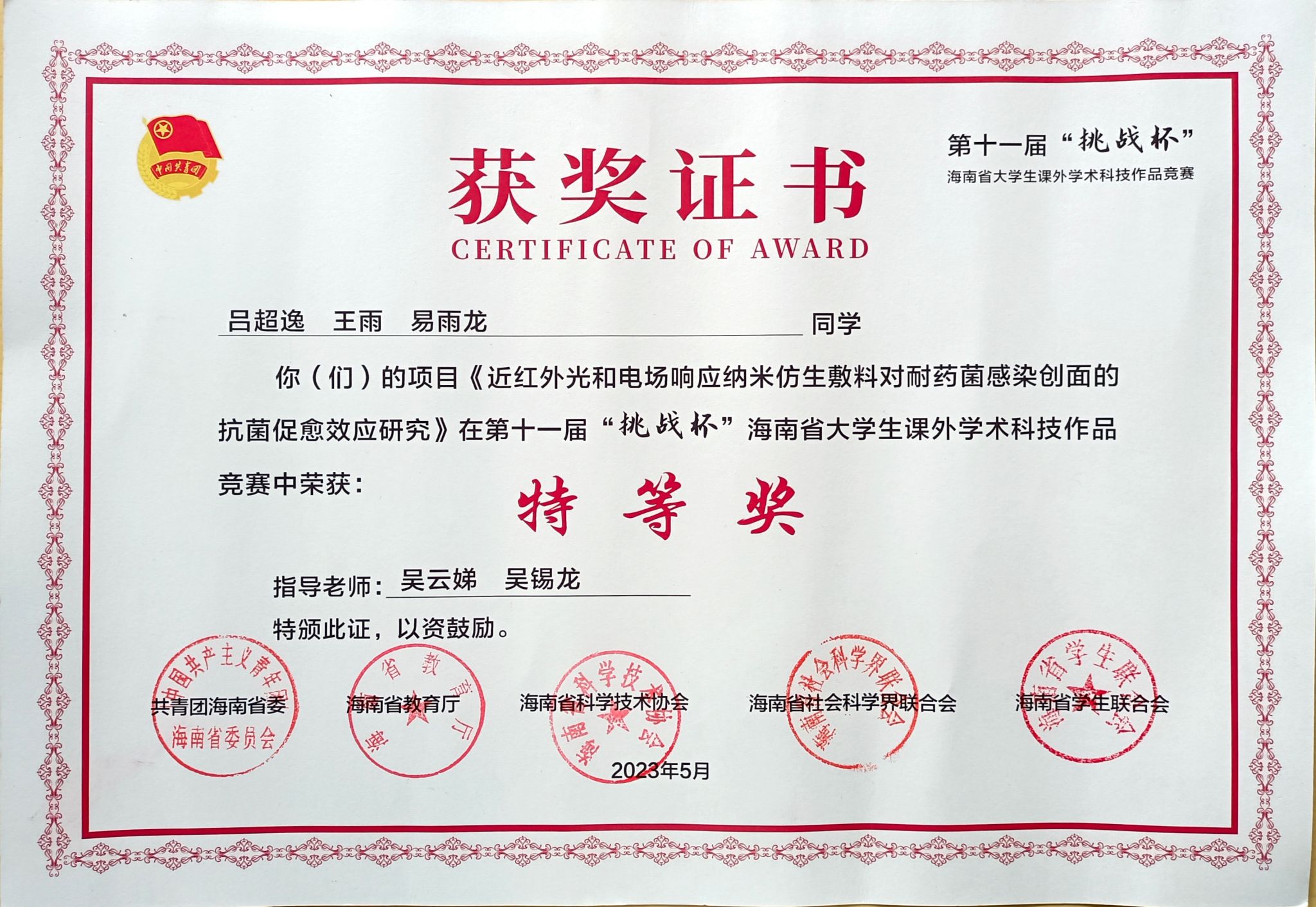 经过紧张激烈的现场答辩和专家点评,海南老员工命科学公司2019级生物工程专业吕超逸等同学的团队作品《近红外光和电场响应纳米仿生敷料对耐药菌感染创面的抗菌促愈效应研究》从进入决赛的145件作品中脱颖而出,荣获自然科学类特等奖。