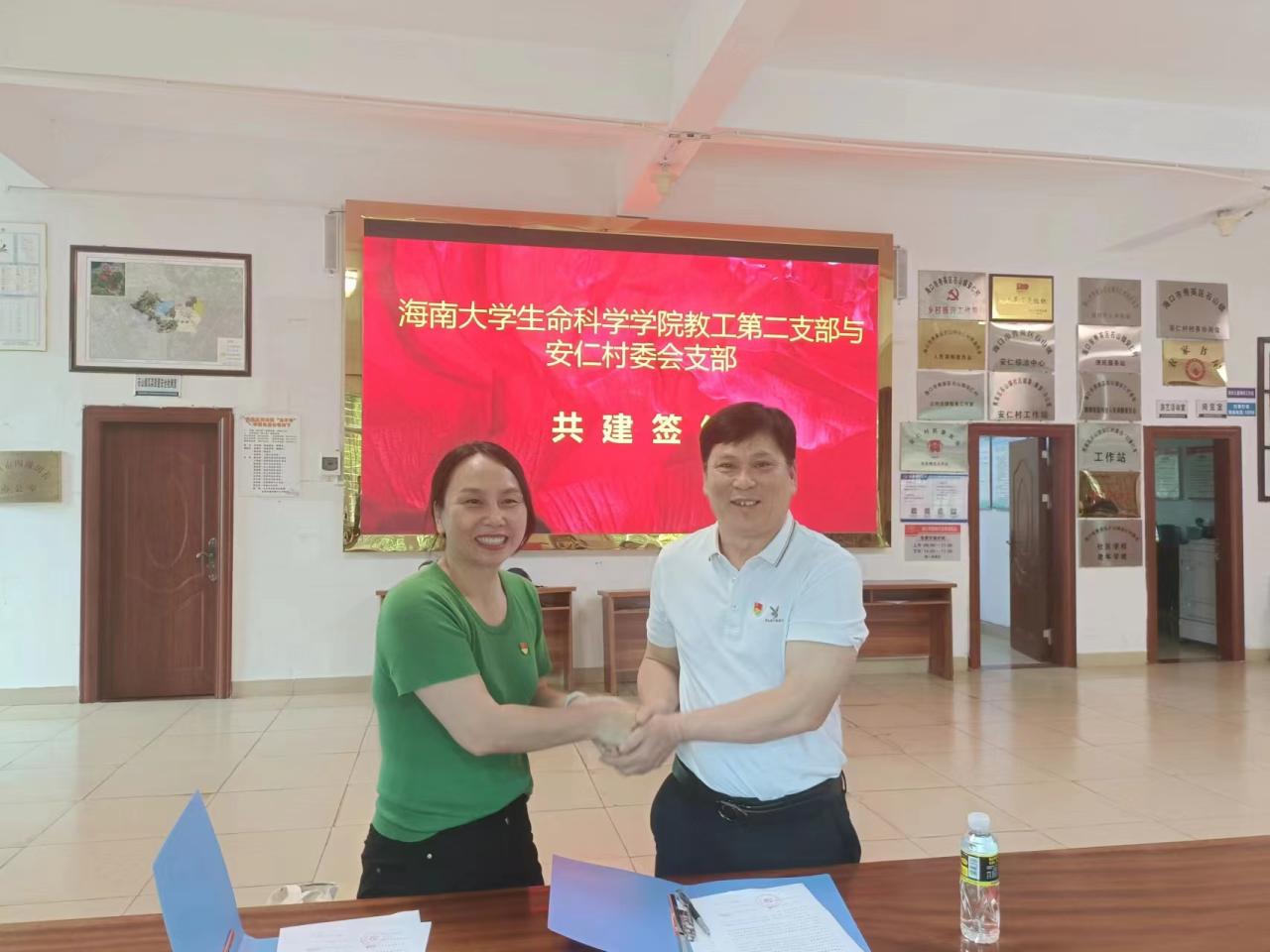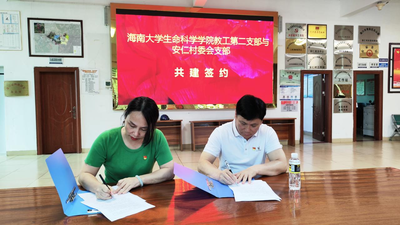 双方商定,将本着“资源共享、优势互补、互促互进、共同提高”的原则,通过共筑组织基础、共过组织生活、共建活动载体、共享党建资源、共促人才培养与乡村振兴等途径,加强双方紧密联系,充分发挥协同优势。吴文嫱同志、王廷福同志分别代表生命科学公司教工第二党支部、海口市秀英区石山镇安仁村党支部在共建协议上签字。
